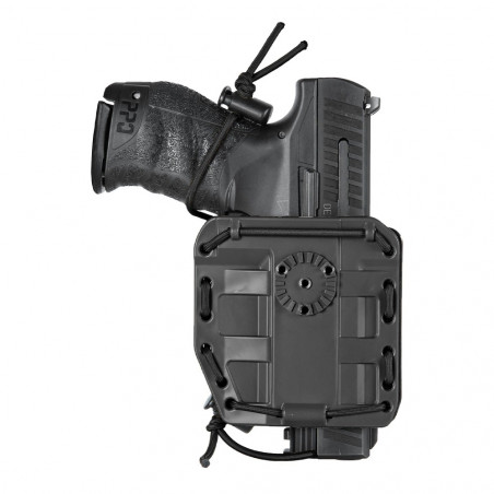Holster en polymère injecté thermo-moulé professionnel Compatible avec toute arme de poing grâce à un élastique de serrage Simple rétention de niveau 1 par élastique de serrage Livré avec la fixation ceinture/ceinturon (60 mm) et passant M.O.L.L.E 8K87 Coloris : noir