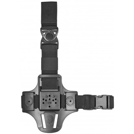 Plaque de cuisse compacte en polymère injecté thermo-moulé professionnel Une sangle de cuisse avec système anti-dérapant réglable et fermée par clip Plateforme permettant de monter un holster (avec fixation 2 ou 3 vis) et deux accessoires équipés du système étoile VEGA HOLSTER® Fixation pour ceinture/ceinturon (50 mm) par auto-agrippant reliée à la plateforme par clip Livré sans accessoires