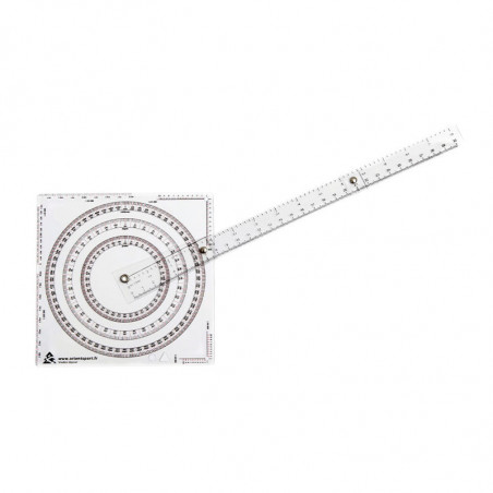 1/100000ème Graduations en millièmes, degrés, grades Bras amovible et rotatif avec échelles en mm et 1/25000ème permettant de reporter un cap, une position et une distance jusqu'à 7,5 km Triangle et cercle matérialisant le départ et l'objectif à atteindre Dimensions : 15 x 15 cm