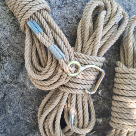 Cordes en chanvre ancien de 10 m de long, sertie à chaque extrémité dont l'une doté d'un crochet.