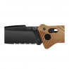 Le manche est constitué de deux plaquettes en polymère chargé de fibres de verre. Ces plaquettes sont vissées à la mécanique par des vis en acier inoxydable dont l'une d'elle loge astucieusement une lame coupe sangle. Cette lame courbe et interchangeable est conçue pour couper des sangles, des cordes et des ceintures de sécurité pour favoriser l'extraction en cas d'accident.