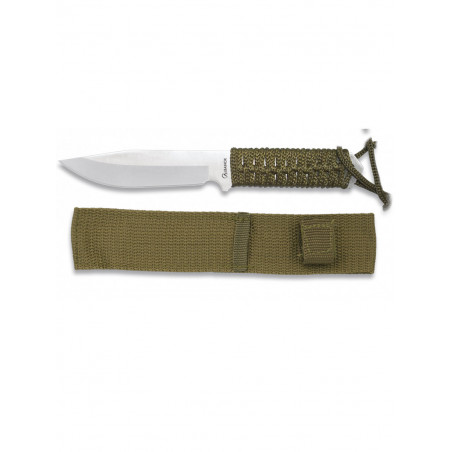 Couteau militaire avec manche recouvert de paracorde, la lame mesure 10,5 cm et le manche 9,50 cm.