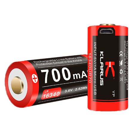 Batterie Lithium-Ion 16340 3.7V 700 mAh rechargeable via sa prise micro USB par cordon USB non magnétique réf 99299 (vendu séparément) Adaptateur secteur réf 99322 et adaptateur allume-cigare réf 99324 vendus séparément Témoin de charge lumineux sur le dessus de la batterie (rouge = rechargement en cours / bleu = charge complète)