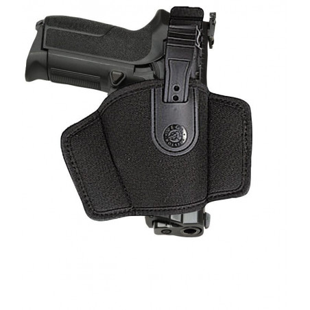 IDÉAL POUR UN PORT DISCRET Holster compact universel en Cordura® Compatible avec toute arme de poing Simple rétention anti-arrachement de niveau 2 par patte de sécurité réglable et amovible type Stop Snap double sécurité Fixation pour ceinture (40 mm)