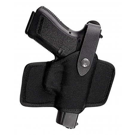 IDÉAL POUR UN PORT DISCRET Holster compact universel en Cordura® Compatible avec toute arme de poing Simple rétention de niveau 1 par patte de sécurité réglable et amovible Fixation port droit ou incliné pour ceinture (40 mm)