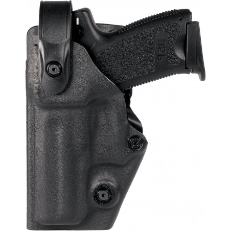 Holster en polymère injecté thermo-moulé professionnel qui assure un maintien parfait de l'arme Revêtement intérieur pour une meilleure protection de l'arme et isolation sonore Triple rétention anti-arrachement de niveau 4 : - 1ère rétention : système Push & Front - 2ème et 3ème rétention : système Pull Side double sécurité Vis de rétention réglable Livré avec le passant ceinture/ceinturon (60 mm) 8K23 Adaptable sur toutes les fixations pour holster VEGA HOLSTER® (plaque de cuisse, plaque M.O.L.L.E., etc.)