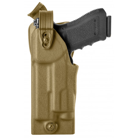 Holster en polymère thermo moulé professionnel pour Glock 17/22 toutes générations équipé d'une lampe tactique avec pointeur laser Viridian X5L / X5L-R Doublure intérieure en feutrine assurant une protection anti-rayure de l'arme ainsi qu'une isolation phonique Système d'activation automatique du laser (ECR) permettant un allumage instantané du laser à la sortie de l'arme et son extinction lors de la mise en place dans le holster Double rétention par le système Push & Front réglable en hauteur et par un levier de blocage pour une double sécurité Livré avec le passant ceinture/ceinturon 8K23 et la patte de sécurité 8K97 Poids : 345 g Adaptable sur toutes les fixations pour holster de chez VEGA HOLSTER (plaque de cuisse, plaque M.O.L.L.E. etc.)