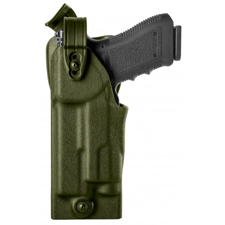 Holster en polymère thermo moulé professionnel pour Glock 17/22 toutes générations équipé d'une lampe tactique avec pointeur laser Viridian X5L / X5L-R Doublure intérieure en feutrine assurant une protection anti-rayure de l'arme ainsi qu'une isolation phonique Système d'activation automatique du laser (ECR) permettant un allumage instantané du laser à la sortie de l'arme et son extinction lors de la mise en place dans le holster Double rétention par le système Push & Front réglable en hauteur et par un levier de blocage pour une double sécurité Livré avec le passant ceinture/ceinturon 8K23 et la patte de sécurité 8K97 Poids : 345 g Adaptable sur toutes les fixations pour holster de chez VEGA HOLSTER (plaque de cuisse, plaque M.O.L.L.E. etc.)