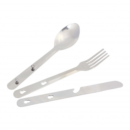 Le couteau et la fourchette se clipent sur les rivets de la cuillière.