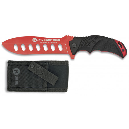 Poignard d'entraînement avec œillet pour dragonne Manche en revêtement caoutchouc antidérapant Lame lisse en aluminium Livré avec un étui en nylon noir Fixation pour ceinture/ceinturon (50 mm) Longueur totale : 27,7 cm Longueur de la lame : 15 cm Epaisseur de la lame : 5 mm Poids : 175 g (sans étui) Couleur de la lame : rouge Couleur du manche : bicolore noir/rouge