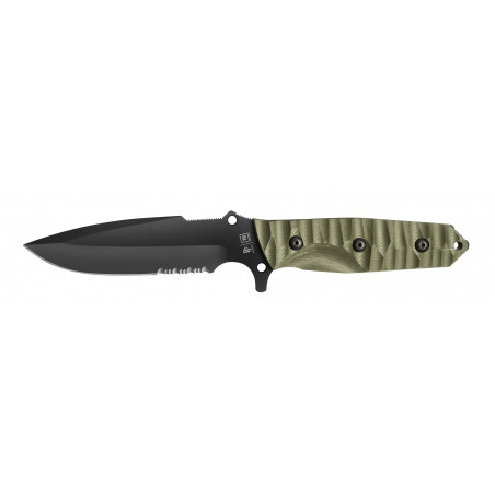 Poignard tactique avec œillet pour dragonne Manche G10 (laminé de couches de fibre de verre avec une résine époxy) résistant, dur, léger et durable Lame semi-crantée pleine soie en acier inoxydable Mox® revêtu de PVD Brise-vitre Livré avec un étui en kydex noir Fixation sur passant rapide système M.O.L.L.E. réf 220222 (non fourni) Longueur totale : 24,6 cm Longueur de la lame : 12,5 cm Epaisseur de la lame : 3,5 mm Poids : 210 g (sans étui) Couleur de la lame : noir Couleur du manche : vert OD