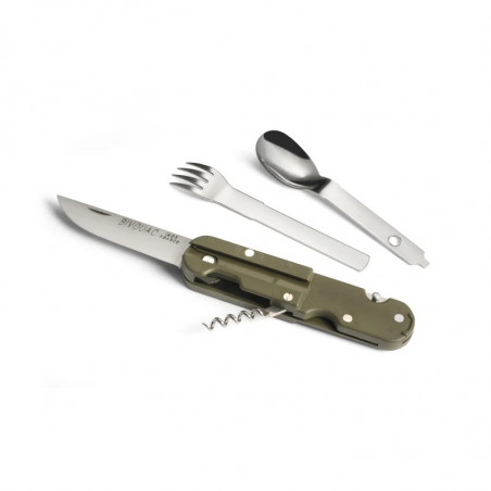 Avec décapsuleur, fourchette, cuillère, ouvre-boîte, tire-bouchon.