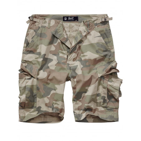 Bermuda militaire camouflage américain woodland délavé de la marque Brandit en ripstop 100% Coton, léger, fonctionnel et résistant aux déchirures, matière agréable à porter l'été.