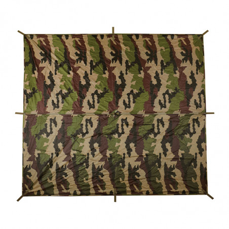Tissu polyester 210T Ripstop® 2.5 LIGHT-SHELL Enduction imperméable 4000 mm Coutures étanches renforcées Système d'accroche avec 8 oeillets en métal renforcés Répartition des points d'ancrage multi-fonctionnelle Coutures et sangles en nylon Dimensions de la bâche : 2 x 2 m Livrée dans une housse de transport avec fermeture par cordon de serrage Dimensions de la housse : L22 x H25 cm Poids : 480 g Couleur : cam ce